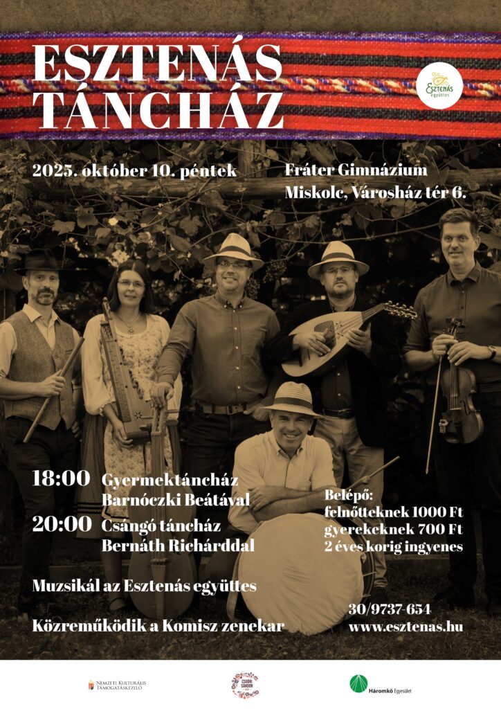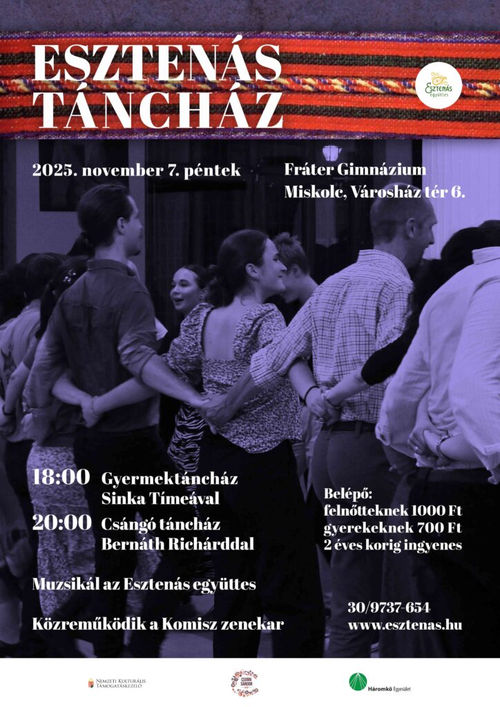 Esztenás táncház: 2025. november 7. péntek – szeretettel várunk mindenkit! Hat órától gyermektáncház, nyolc órától moldvai mulatság. Az Esztenás mellett közreműködik a Komisz zenekar, a táncházat vezeti Sinka Tímea és Bernáth Richárd. Gyertek!