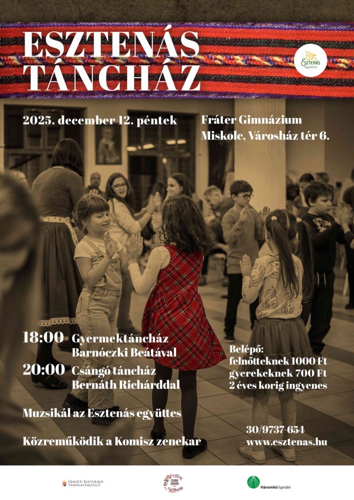 Szeretettel várunk mindenkit 2025. április 25-én pénteken a miskolci Fráter Gimnázium aulájában! Hat órától gyermektáncház Sinka Tímeával, nyolc órától moldvai táncház Bernáth Richárddal. Az Esztenás mellett ezúttal is közreműködik a Komisz zenekar. Gyertek!